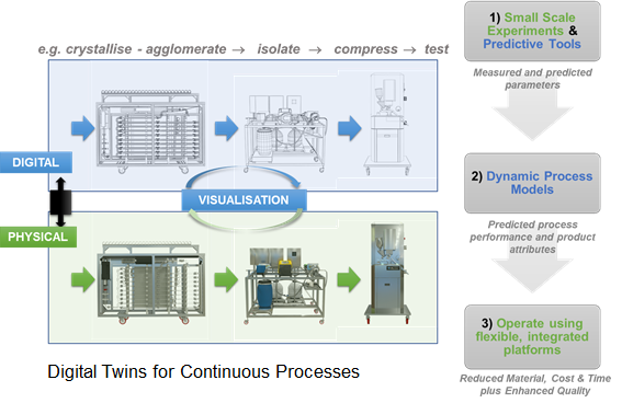 The CMAC digital twin refers to model-based simulations of transformations within unit operations or material attributes resulting from processes and characterisation tools. Data from small scale experiments/measurements are used to parameterise the models used to generate the digital twins.
